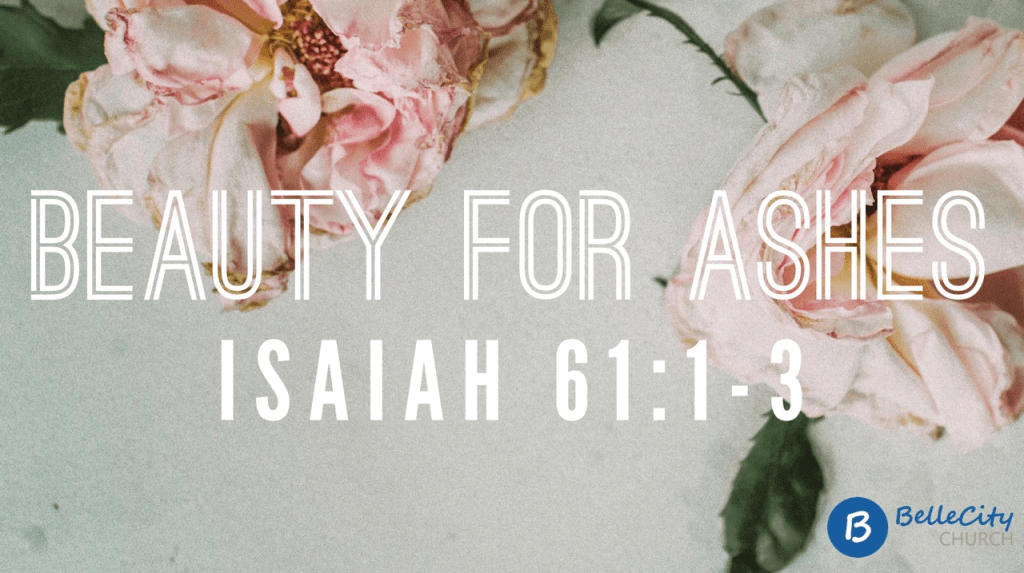 - Beauty from ashes- based on Isaiah 61:3. I was thinking primarily of physical healing because of what God did for me. But everyone finds their life in ashes at one point or another, so I thought it had a broad application.