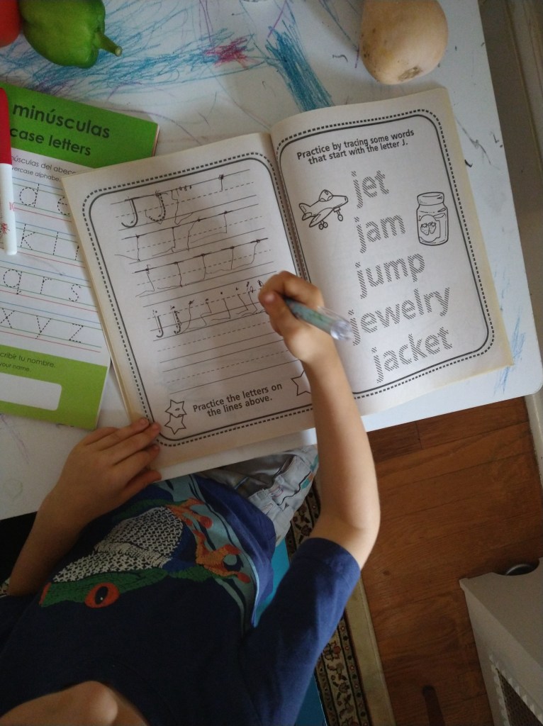 We started two weeks ago with the “J” since it’s the first letter of his name. Cubby initially resisted because he “would rather play with his dinosaurs,” but got into it once he got going.