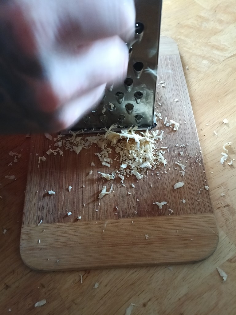 You could even just cut it into small pieces if grating it starts to be a hassle. That’s what we did when the piece of root got too small to grate.
